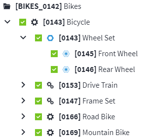 A bicycle contains a wheel set, which is a part that can be removed in one piece and replaced with other components. In the asset type tree, a regular asset type component called "Wheel Set" is added to the "Bicycle" regular asset type. This generic regular asset type component is configured once and re-used to configure the different types of bicycles in the asset type tree.