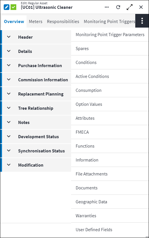 Data is captured on the following tab(s) of the edit screen: Overview, Meters, Responsibilities, Monitoring Point Triggers, Monitoring Point Trigger Parameters, Spares, Conditions, Active Conditions, Consumption, Option Values, Attributes, FMECA, Functions, File Attachments, Documents, Geographic Data, Warranties and User Defined Fields. Below is a list of descriptions for the fields in the sections on each tab.