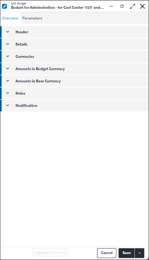 - Financial Year: The financial year of the budget. Only open financial years are selectable.