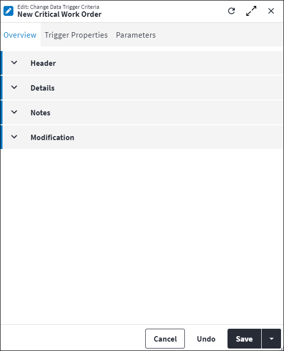 Data is captured on the following tab(s) of the edit screen: Overview, Trigger Properties and Parameters. Below is a list of descriptions for the fields in the sections on each tab.