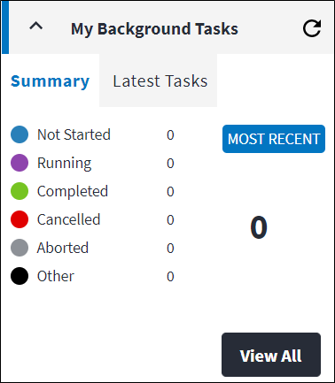 The purpose of the My Background Task widget is to provide users with a visual summary of their running background tasks. The background task widget is found in the Assist panel in the sidebar, For more information on Background Tasks, please refer to the Background Tasks module.