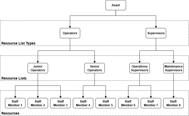 Resource lists and resource list types represent sets of resources (staff members and special resources) that have specific rights and play a specific role in a product's manufacturing or assembly process. Resource lists and resource list types are linked to the asset type- or asset responsibilities that are used to manufacture or assemble specific products.