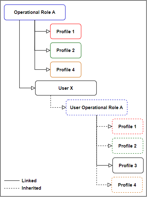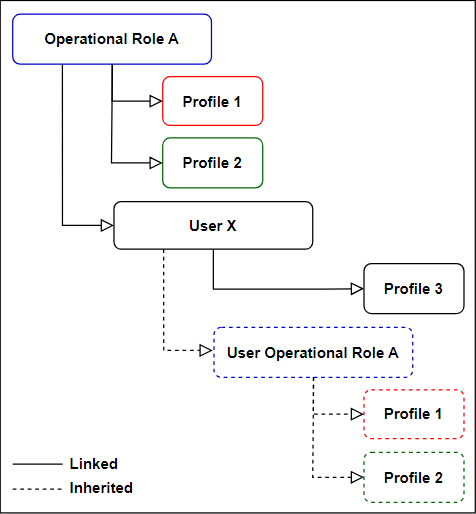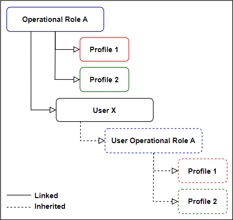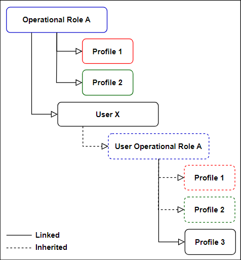 When an operational role is linked to a user, a unique user operational role is created. The profiles that are linked to the operational role are inherited to the user operational role. In the example below, User X is linked to Operational Role A to create User Operational Role A. Profile 1 and Profile 2 are inherited to User X.