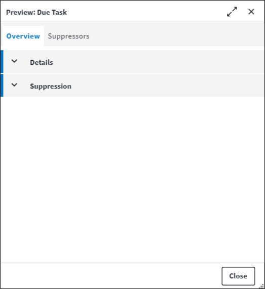 The Due Task screen provides a view of the task that is due and the tasks that are suppressing the due task. No actions can be performed from here. Data is displays on these tabs: Overview and Suppressors. Below is a list of descriptions for the fields on these tabs.