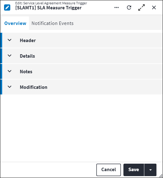 Displays details of when the record was created and last updated. This section is autopopulated and requires no user input.Service Level Agreement Measure Trigger Notification Events